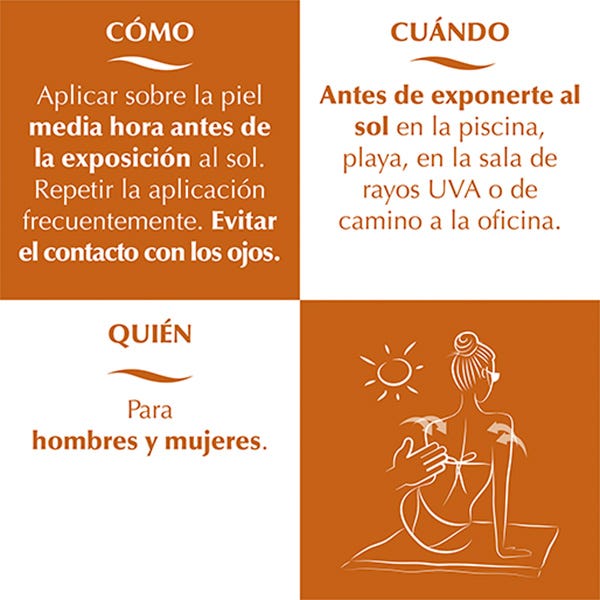 Aplicar sobre la piel media hora antes de la exposición al sol. Repetir la aplicación frecuentemente.