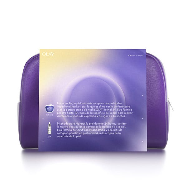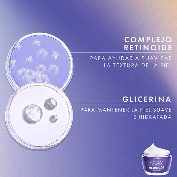 CREMA NOCHE: penetra profundamente en las capas superficiales de la piel. Nuestra mezcla patentada combina la Niacinamida con el Complejo Retinoide. Mantiene la piel hidratada durante 24 horas y ofrece numerosos beneficios. Notarás mejoras visibles en las líneas de expresión y las arrugas, en la suavidad y la luminosidad, en la firmeza de la piel y en las manchas y los poros. Esta crema hidratante, sin fragancias ni colorantes, se absorbe rápidamente y penetra en las capas superficiales de la piel para que te despiertes cada mañana con una piel radiante y rejuvenecida. Utiliza Olay a diario durante 28 días. Verás una verdadera transformación del aspecto de tu piel. La crema hidratante Retinol 24 es adecuada para un uso diario.