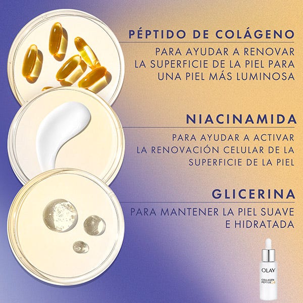 SÉRUM DÍA: revela una piel visiblemente más fuerte y radiante en 14 días con Olay Regenerist Collagen Peptide24 Sérum de día. ¿Sabías que el colágeno es un componente esencial de la piel que sustenta la estructura de la piel? Con la edad, en realidad a partir de los 30 años, la cantidad de colágeno de la piel disminuye, con lo que la piel muestra signos de fatiga. Collagen Peptide24 Sérum de día de Olay contiene péptidos de colágeno que, a diferencia de las moléculas de colágeno, pueden penetrar hasta 10 capas bajo la superficie de la piel. Junto con la vitamina B3, la fórmula actúa rápidamente para estimular la piel con una hidratación intensa que dura 24 horas y actúa con el tiempo para suavizar la textura de la piel y recuperar su barrera protectora y así conseguir una piel fuerte y radiante. La fórmula del sérum Collagen Peptide24 se absorbe rápidamente y deja un tacto no graso. No tiene perfume ni colorantes. Utiliza el sérum Olay Regenerist Collagen Peptide24 durante 28 días. Verás una verdadera transformación de tu piel. El sérum facial Olay Collagen Peptide24 es adecuado para un uso diario.