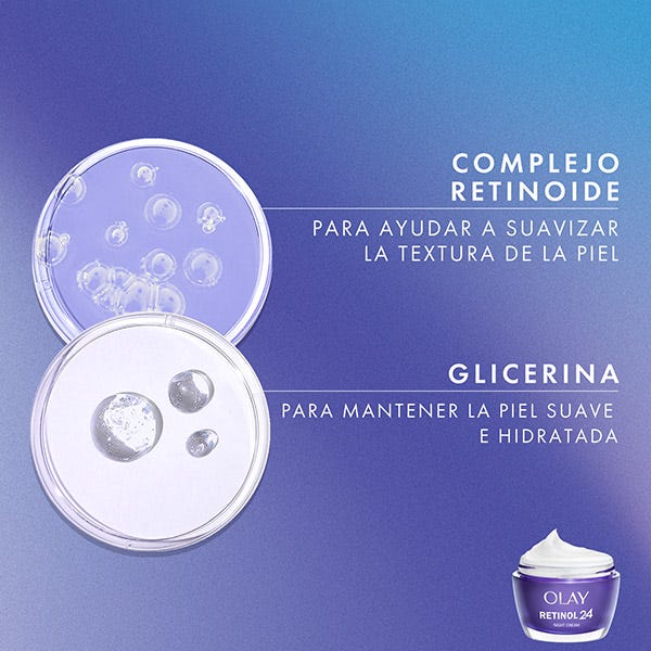 CREMA NOCHE: penetra profundamente en las capas superficiales de la piel. Nuestra mezcla patentada combina la Niacinamida con el Complejo Retinoide. Mantiene la piel hidratada durante 24 horas y ofrece numerosos beneficios. Notarás mejoras visibles en las líneas de expresión y las arrugas, en la suavidad y la luminosidad, en la firmeza de la piel y en las manchas y los poros. Esta crema hidratante, sin fragancias ni colorantes, se absorbe rápidamente y penetra en las capas superficiales de la piel para que te despiertes cada mañana con una piel radiante y rejuvenecida. Utiliza Olay a diario durante 28 días. Verás una verdadera transformación del aspecto de tu piel. La crema hidratante Retinol 24 es adecuada para un uso diario.