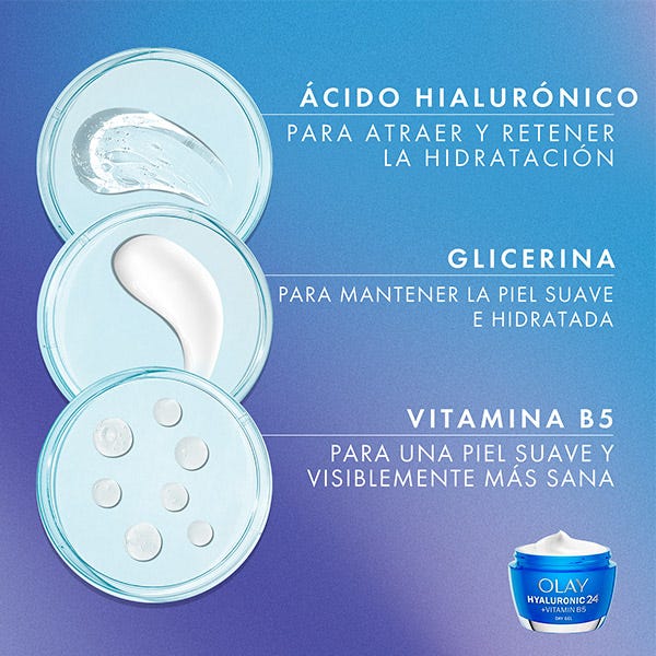 CREMA DÍA: ¿Tienes la piel cansada, tirante y seca? Disfruta de una hidratación profunda. La crema hidratante Hyaluronic 24 + Vitamin B5 de Olay mejora la barrera hidratante de la piel en una sola aplicación y proporciona a tu piel un aspecto más suave y sano en solo 14 días. Esta fórmula ligera, nutritiva y refrescante en gel se ha elaborado con una combinación de Ácido Hialurónico y Vitamina B5, que se absorbe al instante y repone la barrera hidratante natural de la piel, manteniendo la hidratación durante todo el día. Esta crema facial para mujer, sin perfume y no comedogénica, está dermatológicamente testada y proporciona un efecto refrescante al instante con un acabado no graso. Para una piel visiblemente sana e hidratada desde el primer día.