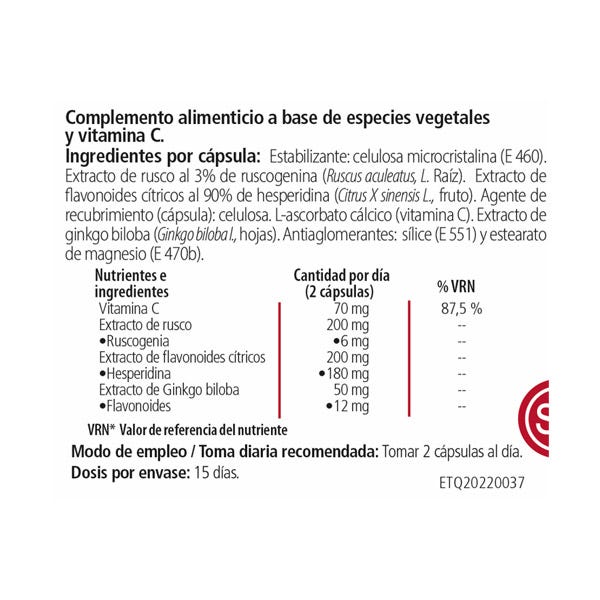 Ingredientes por cápsula: Estabalizante: celulosa microcristalina (E 460), Extracto de rusco al 3% de ruscogenina (Ruscus aculeatus,L. raíz), Extracto de flavonoides cítricos al 90% de hesperidina (Citrus X sinensis L, fruto), Agente de recubrimiento (cápsula): celulosa, L-ascorbato cálcico (Vitamina C), Extracto de ginkgo biloba (Ginkgo biloba L, hojas), Antiaglomerantes: Sílice (E 551) y estearato de magnesio (E 470 b).