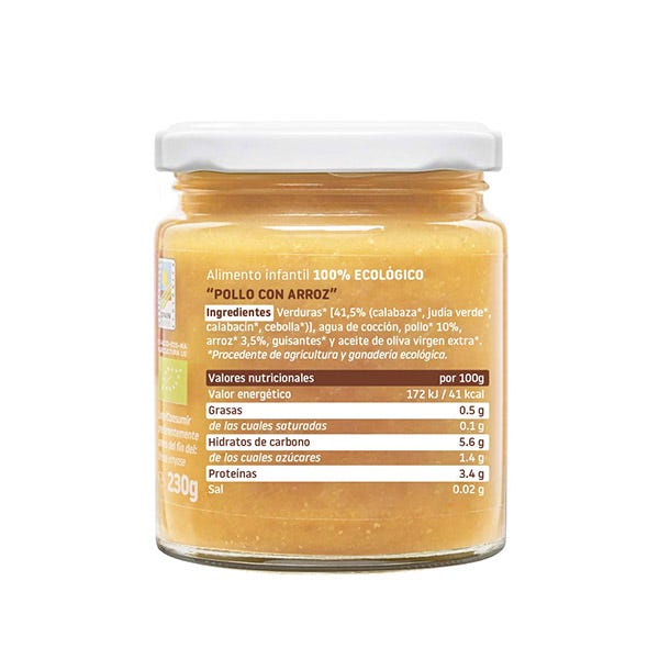 Verduras [41,5% (calabaza, judía verde, calabacín, cebolla)], agua de cocción, pollo 10%, arroz 3,5%, guisantes y aceite de oliva virgen extra.