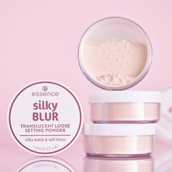 Perfecciona tu piel con los polvos , unos polvos fijadores silky BLUR Translucent de essence de textura vaporosa que fijan el maquillaje con un acabado suave y difuminado.