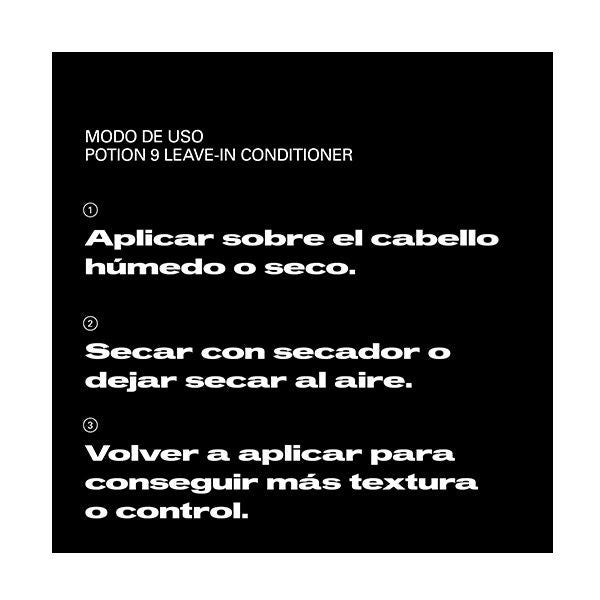Aplicar Potion 9 sobre cabello húmedo o seco. Secar al aire o con secador. Usar calor para redefinir rizos. Reaplicar en seco para añadir textura y control.
