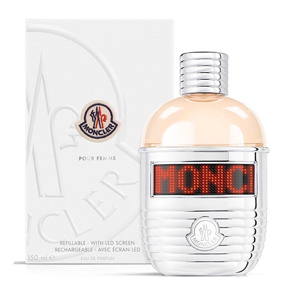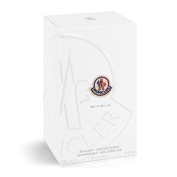 Se exhibe en un frasco único inspirado en las botellas de montaña, vestido con funda y tapa plateadas. Un eco a los orígenes montañeros de Moncler y a su icónica chaqueta .