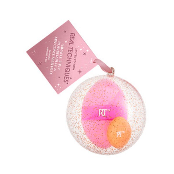 Dentro de una bola de navidad ideal para regalar o colgar en tu árbol, contiene la novedosa Miracle 2 in 1 powder puff para sellar tu rostro y Mini Miracle Concealer Puff para aplicar tu corrector.