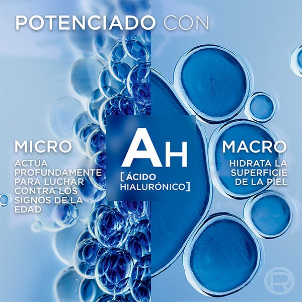 Su fórmula poderosa, con nuestra mayor concentración de ácido hialurónico, reduce visiblemente las líneas y asegura una piel más tonificada, hidratada y suave.