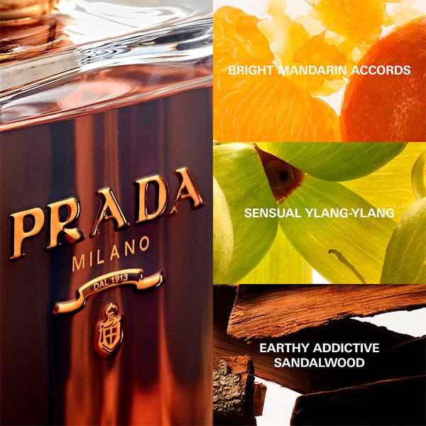 Una fragancia innatamente femenina, ofrecida en un frasco de metal dorado con el logotipo original de Prada sobre piel Saffiano rosa.