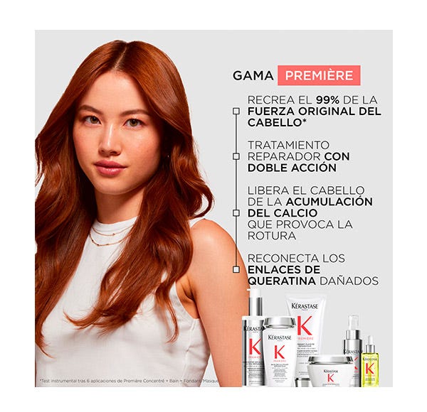 La gama Première, con su doble acción reparadora, rompe el ciclo de daño persistente en el cabello descalcificado con hasta un +97% de refuerzo de la estructura interna, recrea en un 99% la fuerza original del cabello* y ofrece una profunda penetración de activos en el interior de la fibra capilar* para conseguir reducir el daño en la superficie y en el interior del cabello.