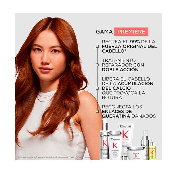 La gama Première, con su doble acción reparadora, rompe el ciclo de daño persistente en el cabello descalcificado con hasta un +97% de refuerzo en la estructura interna, recrea en un 99% la fuerza original del cabello y ofrece una profunda penetración de activos en el interior de la fibra capilar para conseguir reducir el daño en la superficie y en el interior del cabello.