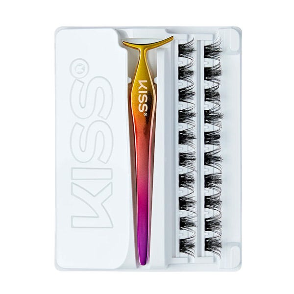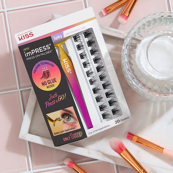¿La mirada perfecta en un solo paso? Es posible con las imPRESS Falsies Cluster de KISS, que revolucionan por completo su juego de pestañas gracias a la tecnología de preadhesión: Un adhesivo sensible a la presión ya está adherido a las pestañas artificiales, que se adhieren inmediatamente cuando se pegan a la línea de las pestañas naturales y después ¡hasta 24 horas!