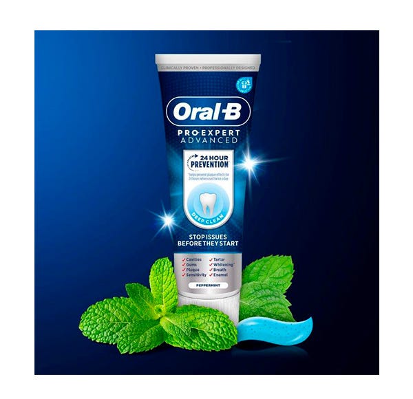 Oral-B Pro-Expert Advanced Science Limpieza Profunda, diseñada profesionalmente con dentistas y probada clínicamente, previene los efectos de la placa bacteriana durante 24 horas al usarse 2 veces al día, así como su adhesión a los dientes y encías.