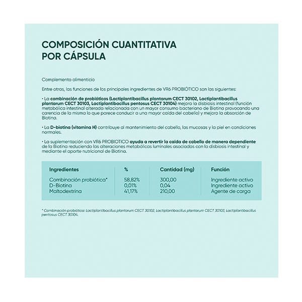 • La suplementación con VR6 PROBIOTICO ayuda a revertir la caída de cabello de manera dependiente de la Biotina reduciendo las alteraciones metabólicas luminales asociadas con la disbiosis intestinal y mediante el aporte nutricional de Biotina.