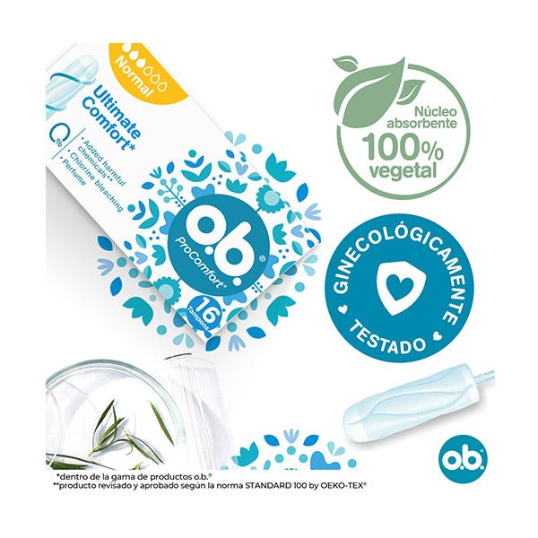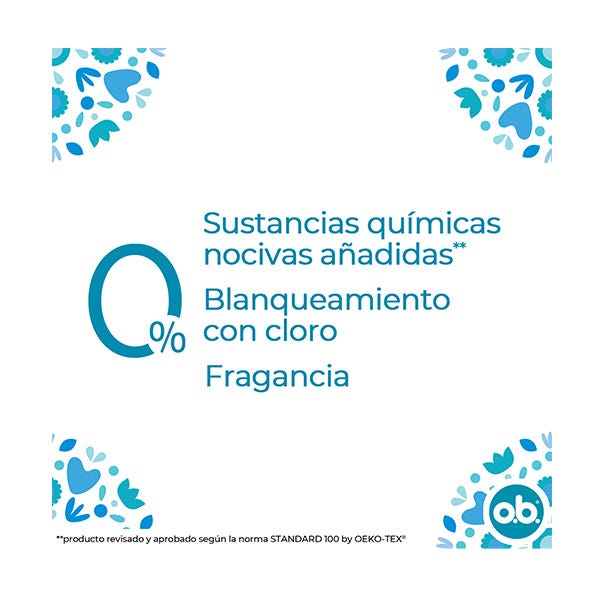 Prueba OB Tampones ProComfort Normal con ranuras Fluid-Lock para protección contra fugas bloqueadas, que guían eficientemente el fluido hacia el interior del tampón.