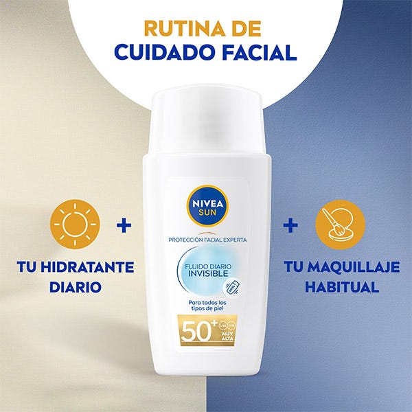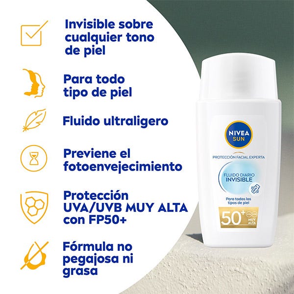 El Fluido Facial Diario Invisible SPF 50+ de NIVEA SUN es de textura ultraligera, de rápida absorción y no deja residuos en la piel. Su fórmula con Niacinamida no es grasa ni pegajosa y ofrece un acabado invisible y un efecto matificante durante 8h. Este protector solar protege la piel desde el EXTERIOR frente a los rayos UVA/UVB y los efectos de la Luz Visible de Alta Energía, como el envejecimiento prematuro. Además, estimula la protección de la piel desde el EXTERIOR gracias al Licocalcón A, un poderoso antioxidante natural que activa el mecanismo de defensa de la propia piel y protege las células contra el estrés oxidativo.