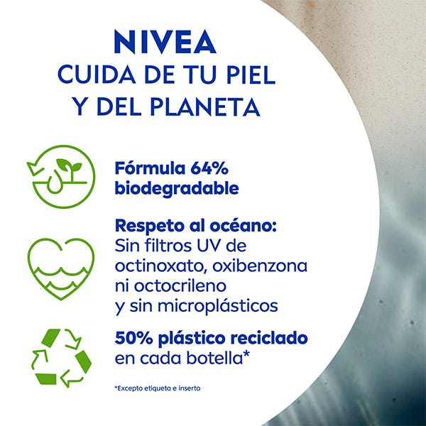 5. Fórmula respetuosa con los océanos sin filtros UV Octinoxate, Oxybenzone, Octocrylene y libre de microplásticos. Bote y tapón con 50% de plástico reciclado (excluyendo etiqueta y boquilla).