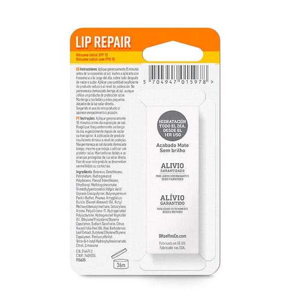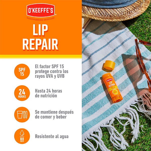 Con 7 hidratantes y acondicionadores, Lip Repair de O'Keeffe’s continúa actuando incluso mientras comes y bebes.