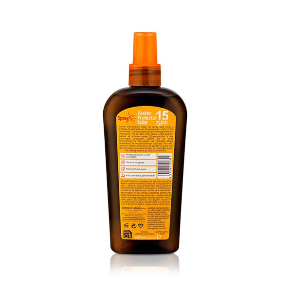 Aceite bronceador con protección SPF 15, resistente al agua. Cómoda aplicación en spray, en formato viaje 250 ml, perfecto para tus días de playa y piscina.