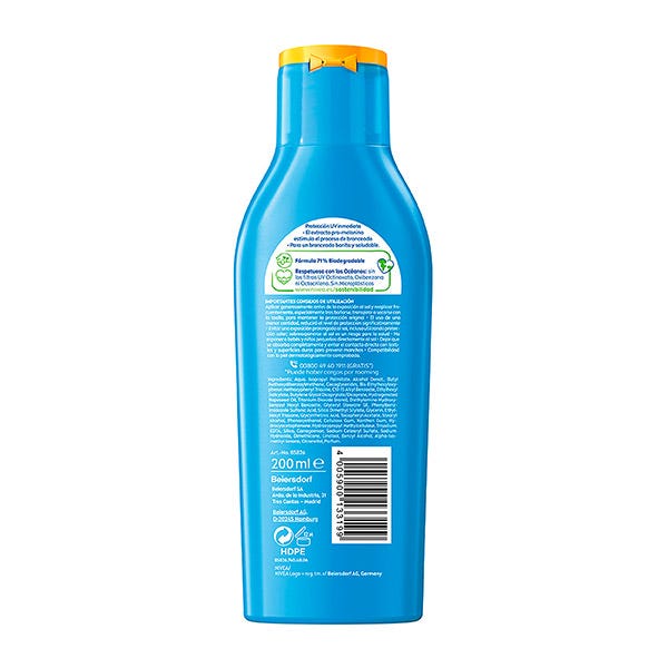 NIVEA SUN Protege & Broncea Loción Solar FP 50 proporciona protección UV inmediata y un bronceado natural de la piel gracias al extracto pro-melanina que estimula la propia melanina de la piel. Para un bronceado bonito y saludable. Su fórmula es no grasa, resistente al agua y no contiene autobronceador.