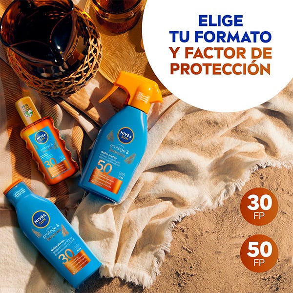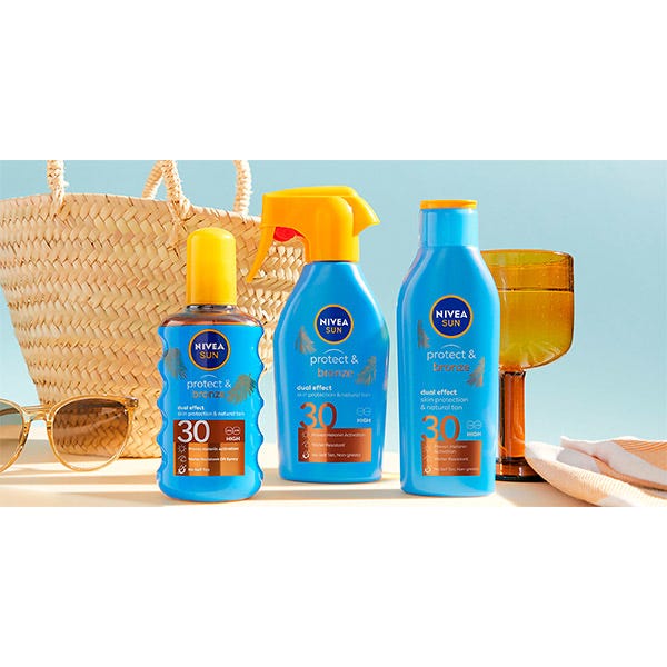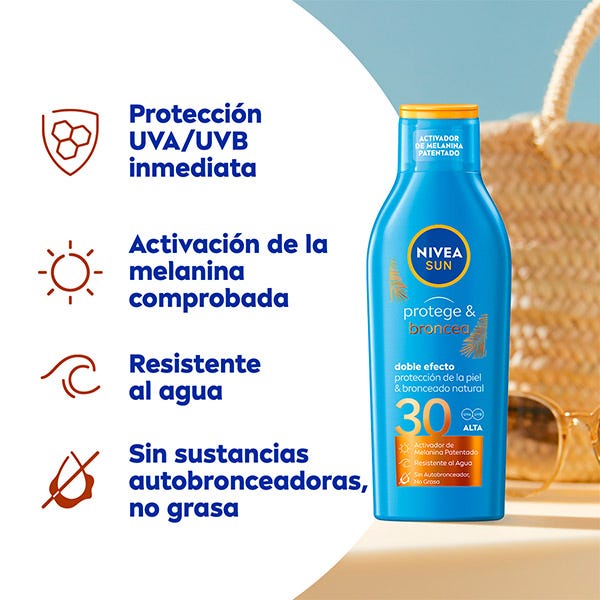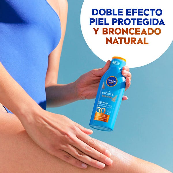 NIVEA SUN Protege & Broncea Loción Solar FP 30 proporciona protección UV inmediata y un bronceado natural de la piel gracias al extracto pro-melanina que estimula la propia melanina de la piel. Para un bronceado bonito y saludable. Fórmula no grasa, resistente al agua y sin autobronceador.