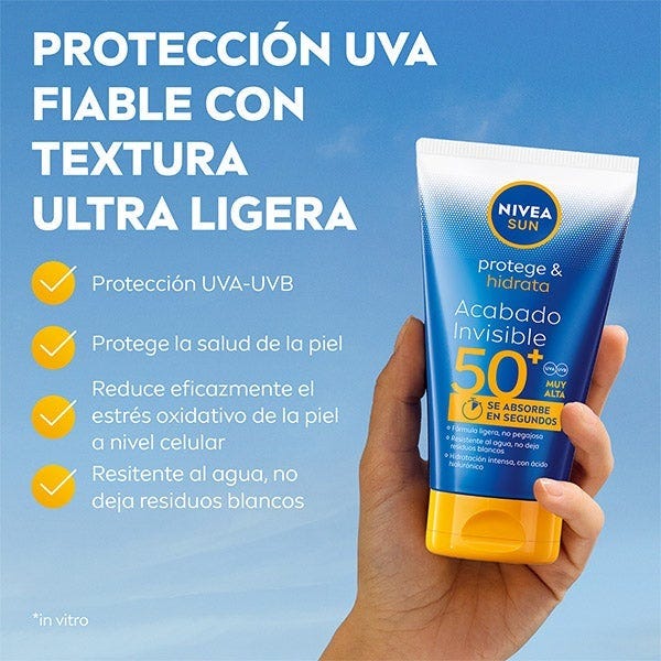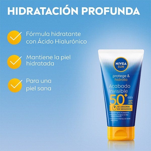 NIVEA SUN Protege & Hidrata Loción Solar Acabado Invisible SPF 50+ ofrece una alta protección eficaz contra los rayos UVA/UVB con una nueva fórmula muy ligera, no pegajosa y de acabado invisible que se absorbe en segundos. Reduce eficazmente el estrés oxidativo de la piel a nivel celular. Su fórmula es resistente al agua, contiene Ácido Hialurónico lo cuál proporciona una hidratación profunda, sin dejar residuos blancos, para una sensación de piel sana y suave.