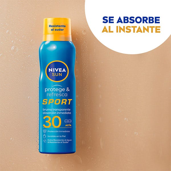NIVEA SUN Protege & Refresca Spray Bruma Invisible proporciona protección UVA/UVB altamente eficaz y deja una sensación refrescante y agradable en la piel. Su fórmula ligera, no grasa y 100% transparente se absorbe al instante y es resistente al sudor y extra resistente al agua, al mismo tiempo que no deja manchas blancas en la piel. Es fácil de aplicar ya que su spray de difusión funciona desde cualquier ángulo.