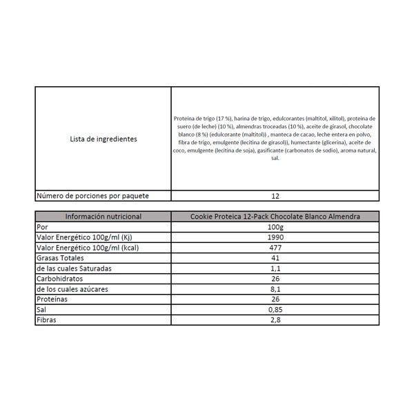 Proteína de trigo (17 %), harina de trigo, edulcorantes (maltitol, xilitol), proteína de suero (de leche) (10 %), almendras troceadas (10 %), aceite de girasol, chocolate blanco (8 %) (edulcorante (maltitol)) , manteca de cacao, leche entera en polvo, fibra de trigo, emulgente (lecitina de girasol)), humectante (glicerina), aceite de coco, emulgente (lecitina de soja), gasificante (carbonatos de sodio), aroma natural, sal.