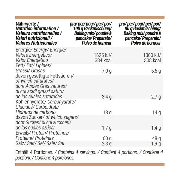 Para unas 4 tortitas, verter 80g de mezcla para hornear (aprox. 8 cucharadas soperas) en un cuenco o en el shaker. Añadir 150ml de agua o leche fría.