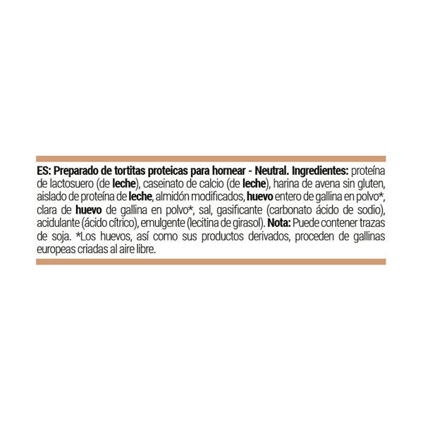 Proteína de lactosuero (de leche), caseinato de calcio (de leche), harina de avena sin gluten, aislado de proteína de leche, almidón modificados, huevo entero de gallina en polvo*, clara de huevo de gallina en polvo *, sal, gasificante (carbonato ácido de sodio), acidulante (ácido cítrico), emulgente (lecitina de girasol).