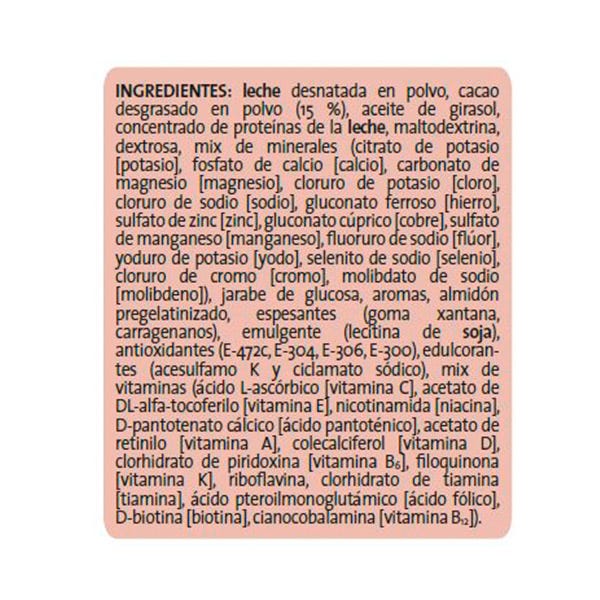 Leche desnatada en polvo, cacao desgrasado en polvo (15%), aceite de girasol, concentrado de proteínas de leche, maltodextrina, dextrosa, mix de minerales (citrato de potasio (potasio), fosfato de calcio (calcio), carbonato de magnesio (magnesio), cloruro de potasio (cloro), cloruro de sodio (sodio), gluconato ferroso (hierro), sulfato de zinc (zinc), gluconato cúprico (cobre), sulfato de manganeso (manganeso), fluoruro de sodio (flúor), yoduro de potasio (yodo), selenito de sodio (selenio), cloruro de cromo (cromo), molibdato de sodio (molibdeno)), jarabe de glucosa, aromas, almidón pregelatinizado, espesantes (goma xantana, carragenanos), emulgente (lectina de soja), antioxidantes (E-742c, E-304, E-306, E-300), edulcorantes (acesulfamo K y ciclamato sódico), mix de vitaminas (ácido L-ascórbico (vitamina C), acetato de DL-alfa-tocoferilo (vitamina E), nicotinamida (niacina), D-pantotenato cálcico (ácido pantoténico), acetato de retinilo (vitamina A), colecalciferol (vitamina D), clorhidrato de piridoxina (vitamina B6), filoquinona (vitamina K), riboflavina, clorhidrato de tiamina (tiamina), ácido pteroilmonoglutámico (ácido fólico), D-biotina (biotina), cianocobalamina (vitamina B12).