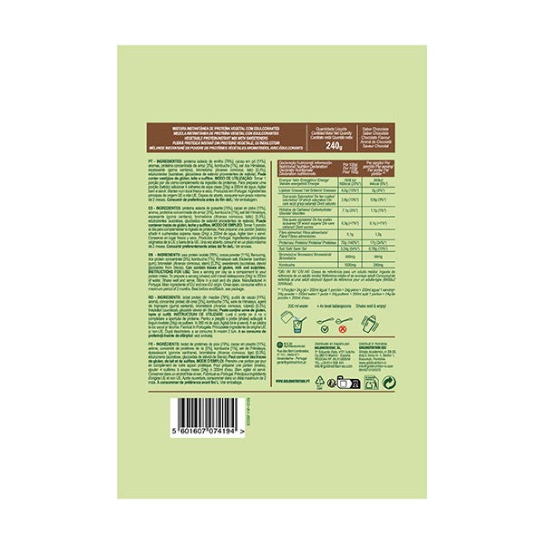 Proteína aislada de guisante [90%], cacao desgrasado em polvo, proteína concentrada de arroz [3%], aromas, extracto de bromelaina (Ananas comosus, tallo), edulcorante (sucralosa), sal, Lactowise® (mezcla patenteada LactoSpore® (Bacillus coagulans) y Fenumannan® (galactomananos de semillas de Fenogreco – Trigonella foenum – graecum L.)). Puede contener trazas de leche, soja, gluten, huevo, sulfito