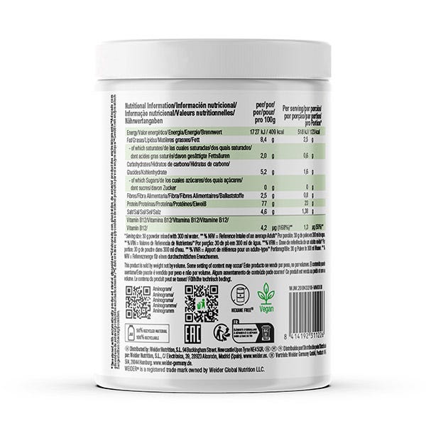 Ahora Weider® ha añadido B12, ya que la ingestión muy baja de esta vitamina puede provocar anemia y deterioro del sistema nervioso y las únicas fuentes veganas fiables de B12 son los suplementos y alimentos enriquecidos con ella.