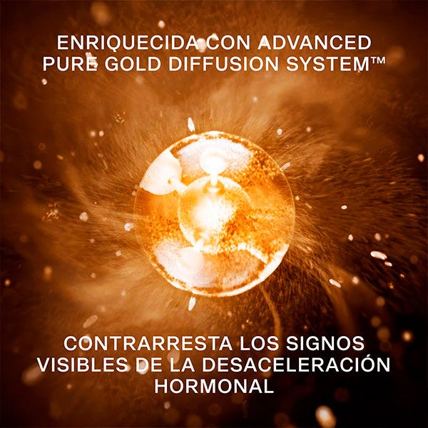 Proporciona hidratación intensa y confort, además de revitalizar y restaurar la piel. Enriquecida con Exclusive Cellular Complex™, Pure Gold y Peptide Powered Meno Complex, ayuda a la piel afectada por los cambios relacionados con la edad, incluidos los provocados por los desequilibrios hormonales. Esta esencia con The Pure Gold Diffusion System™ se ha diseñado para activar procesos que refuerzan la estructura de la piel, compensar los signos visibles inducidos por los cambios hormonales y difundir los ingredientes restauradores que retienen la hidratación y mejoran el confort de la piel. The Pure Gold Diffusion System™ contribuye a recuperar la densidad de la piel restaurando el colágeno perdido y evitando su posterior descomposición. Al mismo tiempo, refuerza la barrera cutánea para retener la hidratación y recuperar el confort.