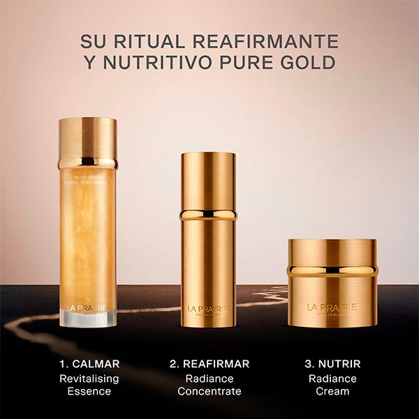 Continúe con los productos de cuidado de la zona del contorno de los ojos, el sérum facial y la crema hidratante de La Prairie Pure Gold Collection.