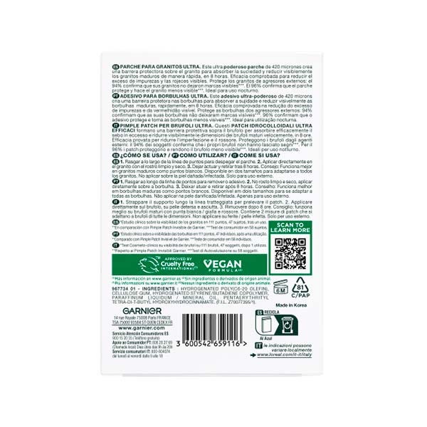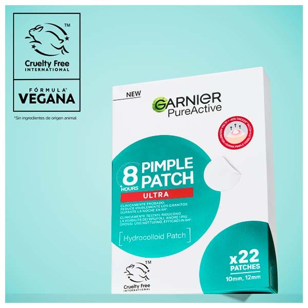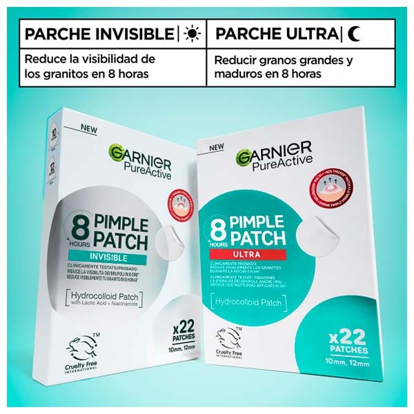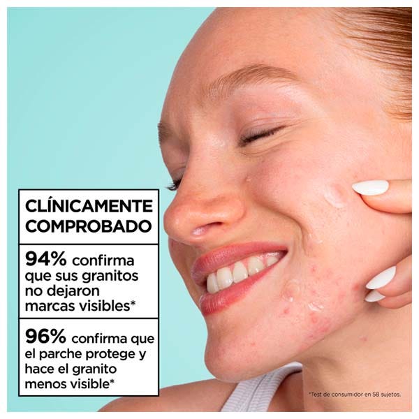 Evaluación clínica de la visibilidad de granos en 111 granos, 47 sujetos, después de un uso. *En comparación con Garnier Invisible Pimple Patch. ***Estudio de consumidores en 58 sujetos.