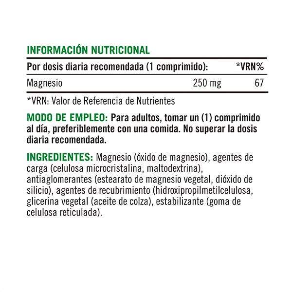 INGREDIENTES: Magnesio (óxido de magnesio), agentes de carga (celulosa microcristalina, maltodextrina), antiaglomerantes (estearato de magnesio vegetal, dióxido de silicio), agentes de recubrimiento (hidroxipropilmetilcelulosa, glicerina vegetal (aceite de colza), estabilizante (goma de celulosa reticulada).