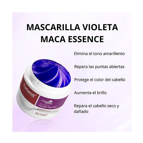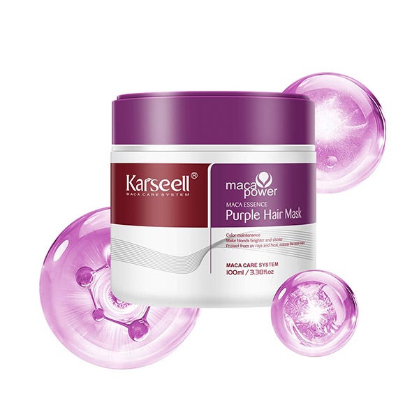 La mascarilla Purple de Karseell está especialmente diseñada para cabello oscuro aclarado. Como una mascarilla intensa contra el tono amarillento, está enriquecida con pigmentos morados especialmente fuertes que hacen que el cabello muy aclarado o con reflejos luzca más brillante, claro y nutrido.