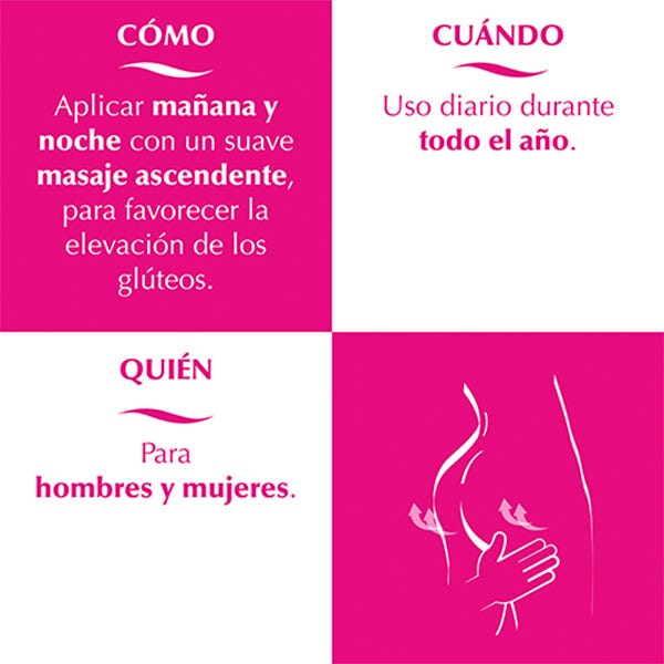Aplícalo por la mañana y por la noche con un suave masaje ascendente, para favorecer la elevación de los glúteos y conseguir una mayor absorción.