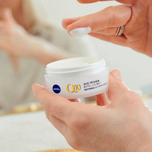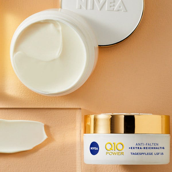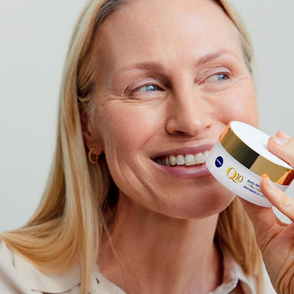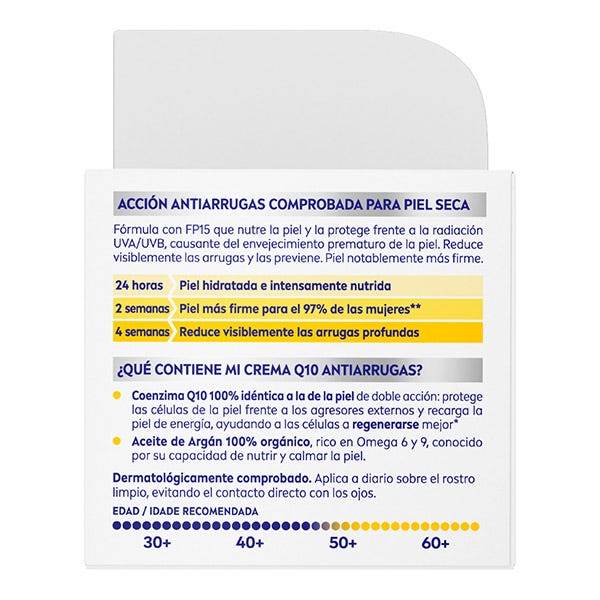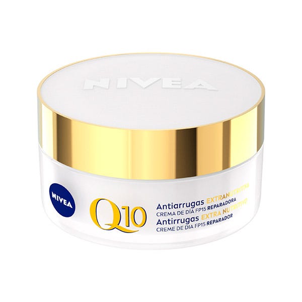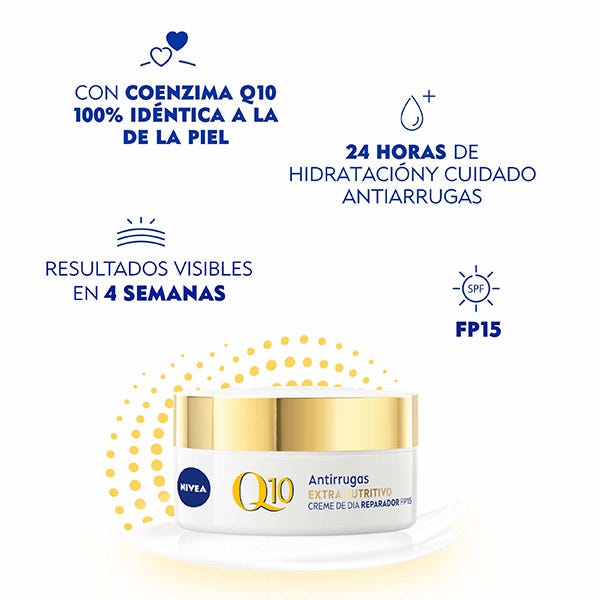 NIVEA Q10 Antiarrugas Crema de Día Extra-Nutritiva está especialmente desarrollada para las necesidades de la piel seca o muy seca. Su fórmula con Coenzima Q10 100% idéntica a la de la piel actúa como protección antioxidante y proveedor de energía. Protege las células de la piel frente a los agresores externos y recarga la piel de energía, ayudando a las células a regenerarse mejor*. Contiene además Aceite de Argán orgánico, que refuerza la barrera de la piel y la nutre intensamente durante 24 horas. Reduce visiblemente las arrugas profundas en 4 semanas y reafirmando la piel en 2 semanas. Con FP15 protege de la radiación UVA/UVB. ¿El resultado? Piel más firme para el 97% de las mujeres** en dos semanas, y reduce visiblemente las arrugas profundas en cuatro semanas. Dermatológicamente comprobado. in vitro *Estudio de 2 semanas con 33 mujeres, 2019.
