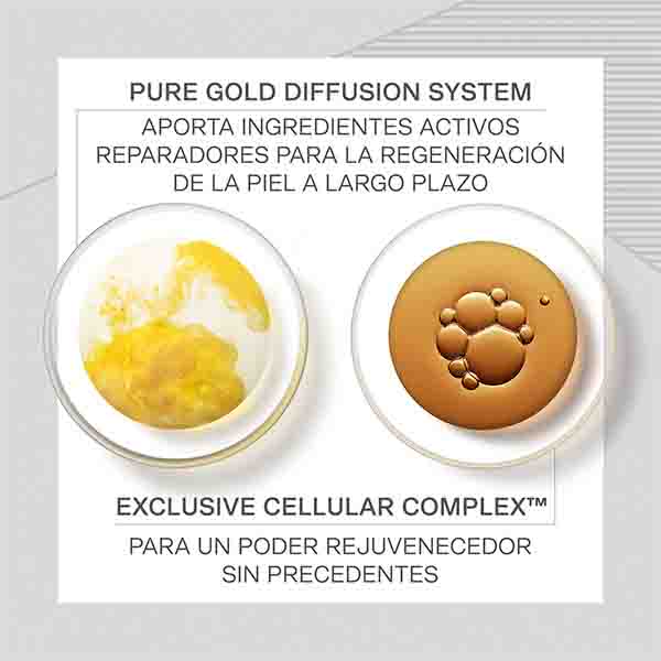 • El Pure Gold Diffusion System contiene oro para un efecto luminoso inmediato e infunde intensamente los ingredientes activos, prolongando su liberación.