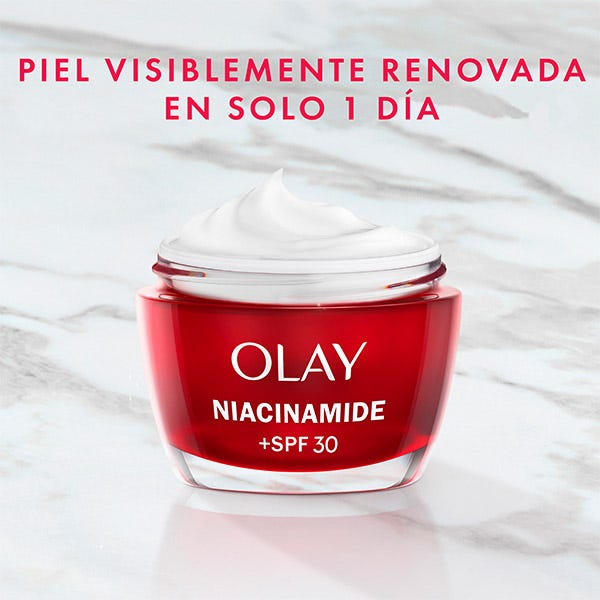 CREMA DÍA: La crema Niacinamida SPF30 de Olay cuenta con la inigualable tecnología SolarSheer, que ofrece una efectiva protección solar SPF30 de amplio espectro frente los rayos UVA y UVB. Ultraligera para que puedas disfrutar por fin de una crema hidratante con protección solar sin textura grasa. Su fórmula también está enriquecida con la mayor concentración de Niacinamida pura al 99% de Olay, capaz de penetrar hasta 10 capas de profundidad para ayudar a activar la renovación celular superficial. Se ha demostrado que la Vitamina E actúa como un antioxidante que ayuda a combatir los efectos perjudiciales de los radicales libres y a mantener la piel con un aspecto joven. Una combinación perfecta que garantiza la hidratación durante todo el día y unos resultados visibles: Tras 1 día, la piel está más suave y revitalizada y, tras 14 días, la firmeza y la elasticidad mejoran visiblemente. Prueba el poder hidratante de la Niacinamida 24 + Vitamina E de Olay.