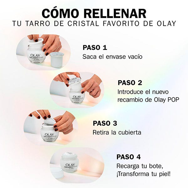 ¿Te encanta tu crema hidratante Olay? ¿Tu bote de cristal blanco favorito está vacío? Consérvalo y rellénalo con Olay POP Recambio, el primer sistema de recambio sin esfuerzo de Olay.