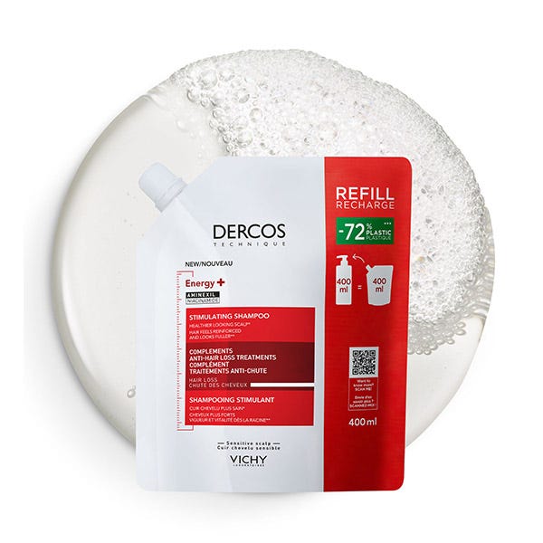 Refill Dercos Energy+ es un champú estimulante para todo tipo de cabellos, enriquecido con la molécula anticaída de referencia Aminexil para ayudar a combatir la caída del cabello*: