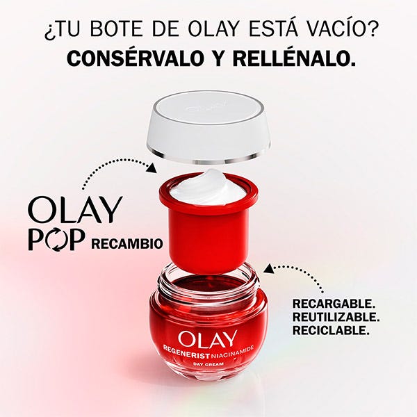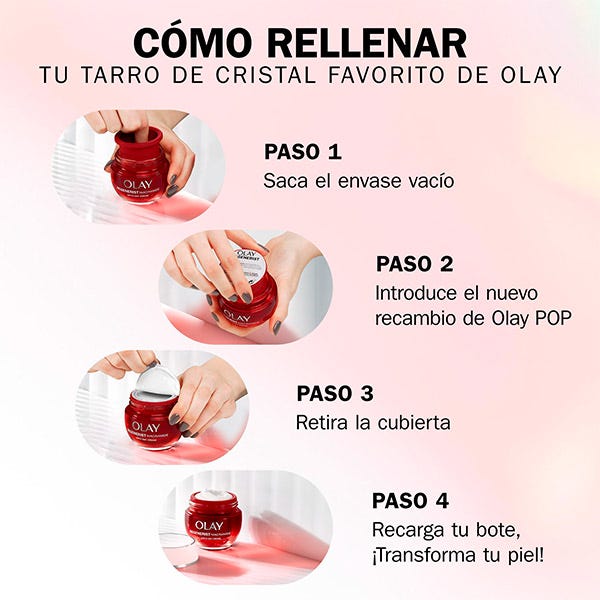 ¿Te encanta tu crema hidratante Olay? ¿Tu bote de cristal rojo favorito está vacío? Consérvalo y rellénalo con Olay POP Recambio, el primer sistema de recambio sin esfuerzo de Olay.