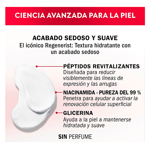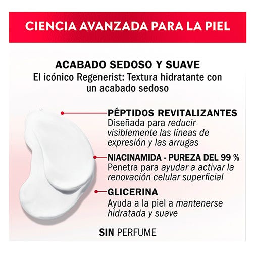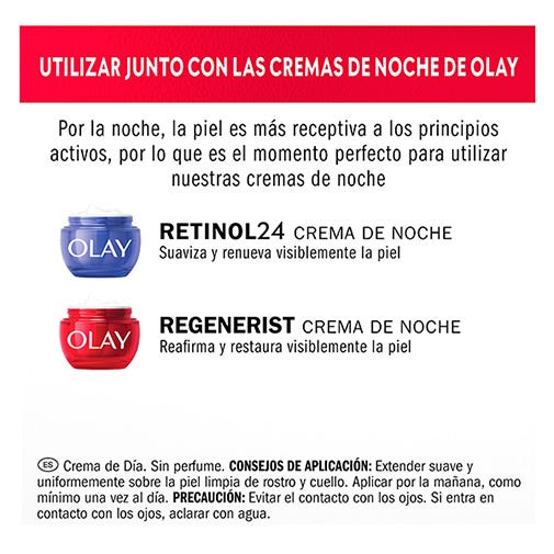 Su fórmula hidratante sin perfume enriquecida con vitamina B3 (niacinamida) y péptidos de Olay penetra profundamente en la superficie de la piel y ayuda a optimizar su renovación celular.