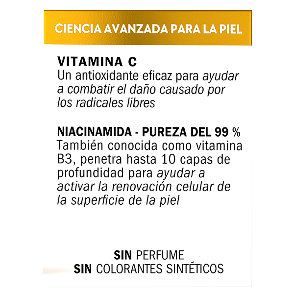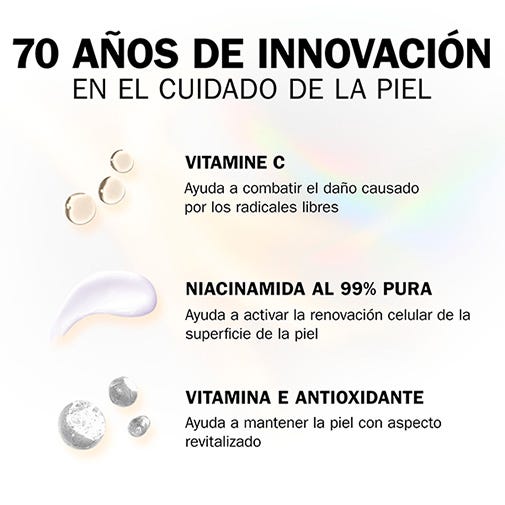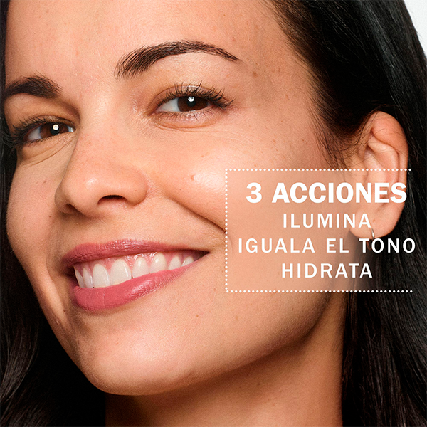 Fórmula elaborada con vitamina C, vitamina B3 y péptidos que ilumina, hidrata y mejora visiblemente la apariencia de la piel.