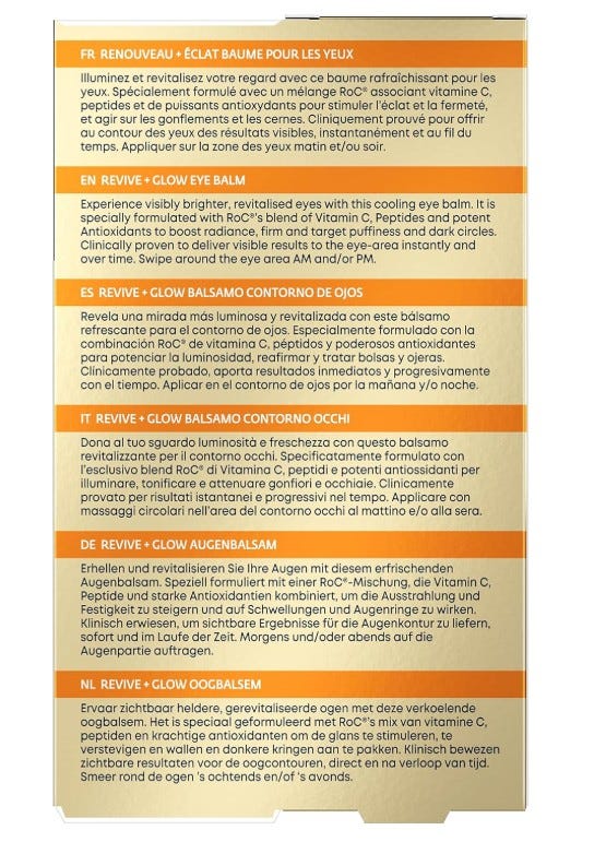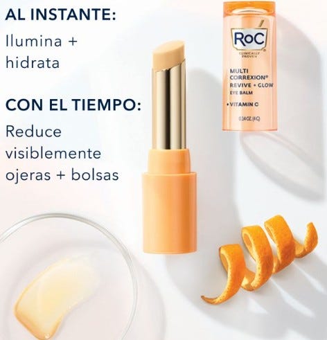 Glow Bálsamo Contorno de Ojos ilumina la mirada. Las ojeras y las bolsas se reducen visiblemente gracias al complejo pendiente de patente de Roc con vitamina C iluminadora y péptidos reafirmantes. Este stick refrescante se desliza de forma invisible con una aplicación sin contacto para unos resultados potentes: En una semana, el 96% notó una mirada más sana y en 4 semanas el contorno de ojos estaba más iluminado, con las ojeras y las bolsas visiblemente reducidas.