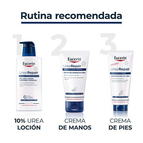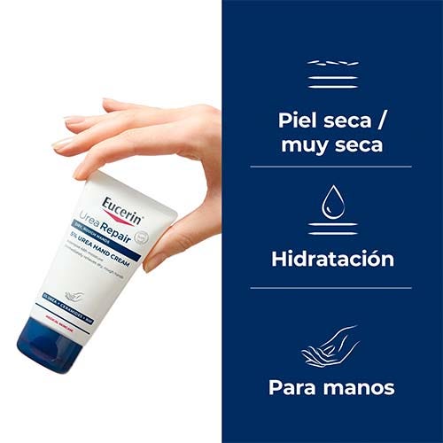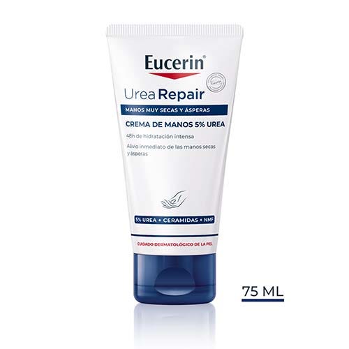 Eucerin UreaRepair PLUS Crema de Manos 5 % Urea contiene Urea, Ceramida y factores naturales de hidratación (NMF). Tiene una capacidad clínicamente probada para aportar a la vez alivio inmediato, hidratación intensa y protección a las manos muy secas, rugosas y tensas, incluso ante un lavado y limpieza frecuentes. Fortalece la barrera natural de la piel y consigue que sea más resistente ante la deshidratación, hasta durante 48 horas. Ayuda a prevenir infecciones, facilita la higiene y es adecuada para quienes padecen xerosis, psoriasis, diabetes y piel madura. También puede usarse como cuidado complementario.