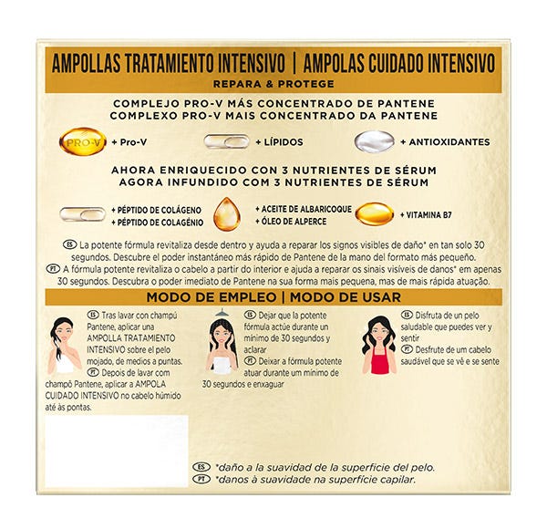 AMPOLLAS PANTENE PARA EL TRATAMIENTO DEL PELO DAÑADO CON EL COMPLEJO PRO-V MÁS CONCENTRADO.